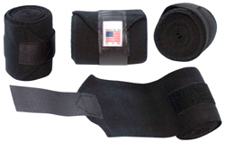 Stall Bandage/Cold Water Bandage 4 inch wide x 9 ft. long w/extra wide durable hook-and-loop-fasteners - set of 4. Also available with matching color TIES. Classic OLD TIME top quality. Perfect stall bandage over Vac's No Bow Wraps. This COTTON knit absorbs perfectly to also be a great COLD WATER bandage. Also available in 12 ft. lengths.